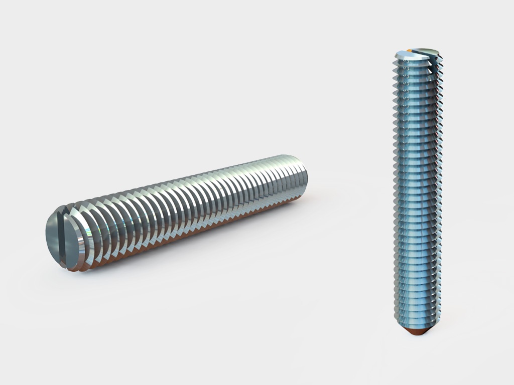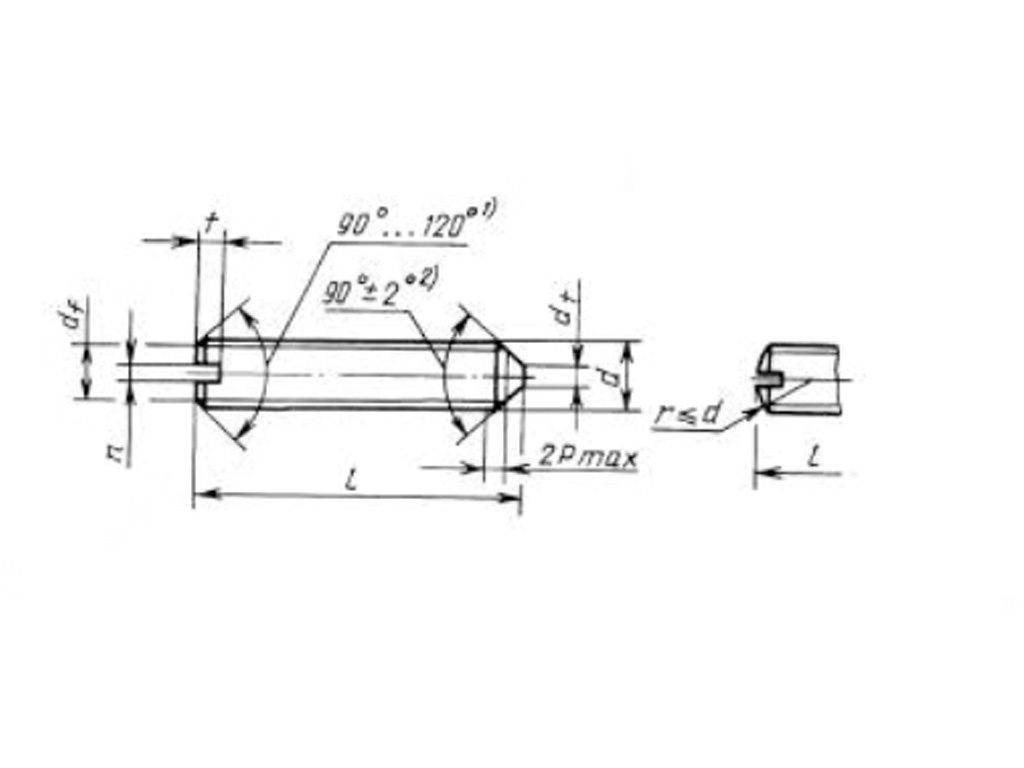 Действующий стандарт распространяется на крепежи с номинальным резьбовым диаметром 1-12 мм. Резьба полная, нарезана по всей длине стержня, ее шаг стандартный (от 0,25 до 1,75 мм), поле допуска 6g. Длина от 2 до 60 мм. С одной стороны стержня острый конический конец, с другой – прямой шлиц.