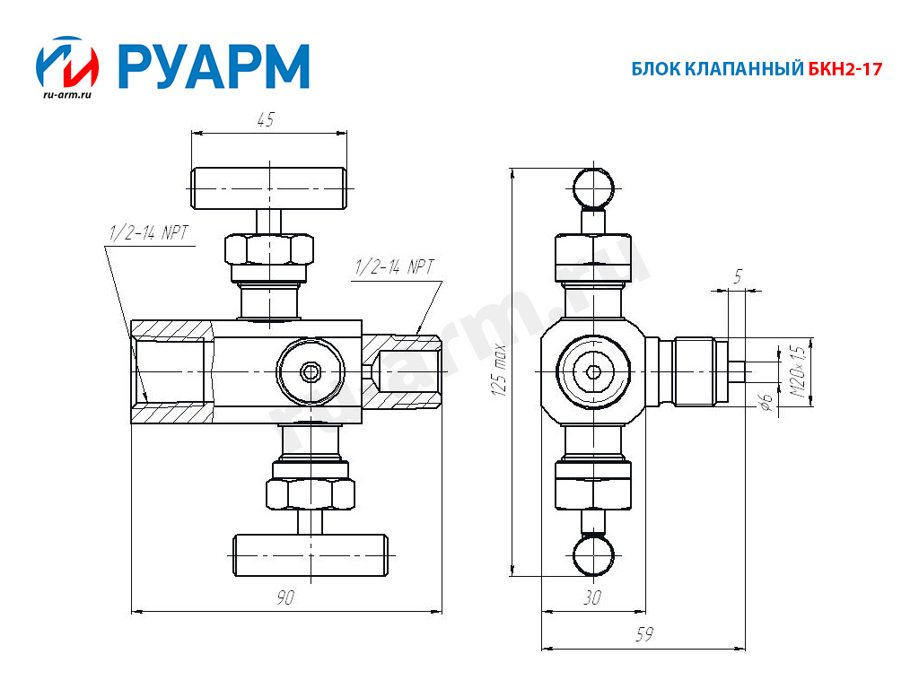 | Блок клапанный БКН2-17 | БКН2-17 | Внутренняя резьба 1/2 NPT | Наружная резьба 1/2 NPT | Наружная резьба М20х1,5 под плоский ниппель |